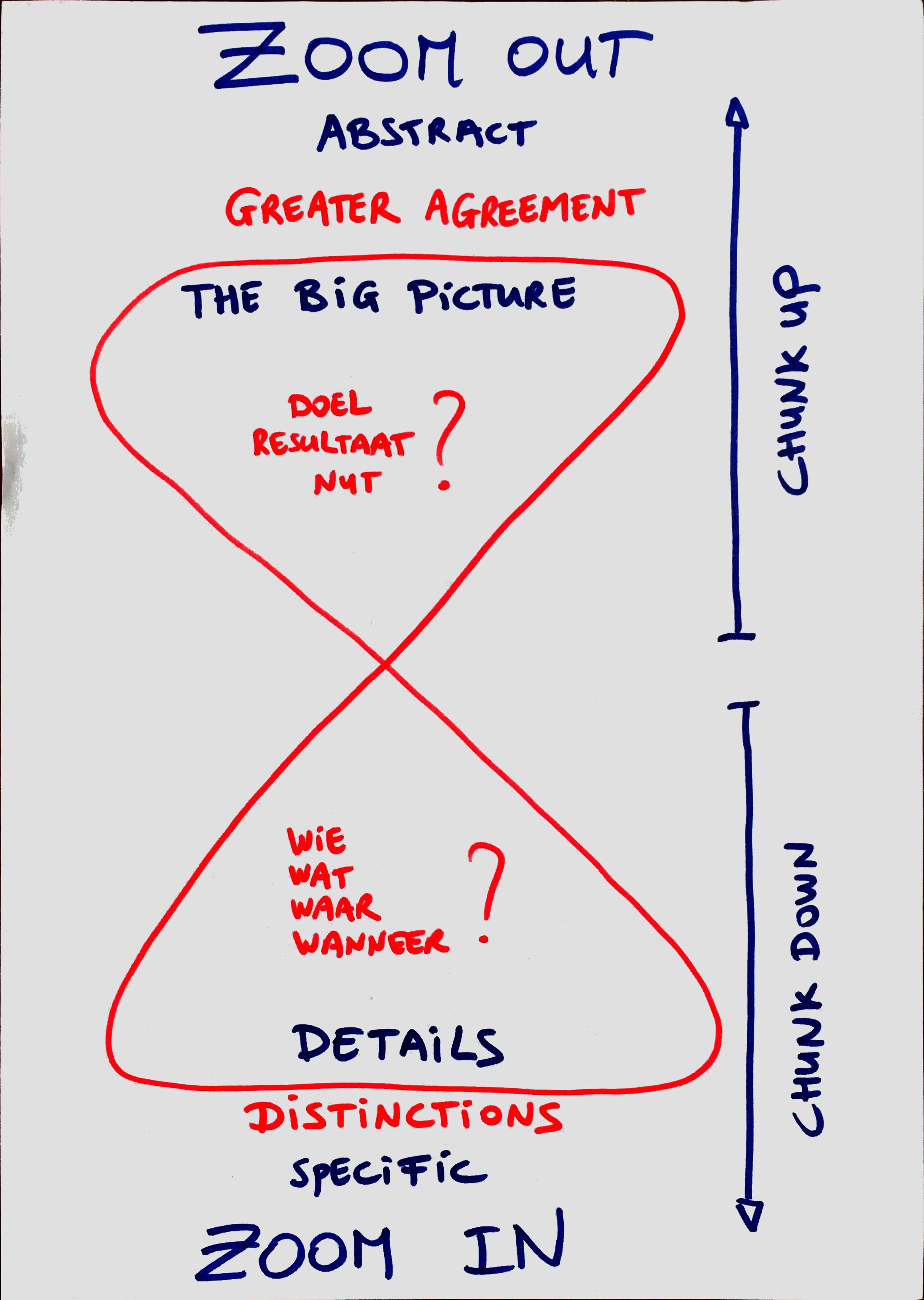 Om te toetsen of beide niveaus in je cv zitten, kun je gebruik maken van een NLP methodiek: ‘up- & downchunken’. Dit is een methode die ik in coachgesprekken toepas. Om de vraag achter de vraag helder te krijgen. Of om verdieping aan te brengen. Of juist om het grote geheel te schetsen. Maar hij is ook perfect te gebruiken bij het opstellen van je cv! Up- & downchunken is namelijk het organiseren van informatie in grotere óf juist kleinere delen. In abstracte of juist heel concrete begrippen: en die hebben een verschillend effect op mensen, blijkt.